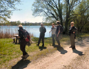 jusqu'aux étangs où quelques pêcheurs guettent le poisson...