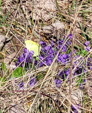 Nous avons vu un petit écureuil faire un petit bout de chemin devant nous, un papillon nous a suivi sur quelques mètres avant de faire une pause sur des violettes.