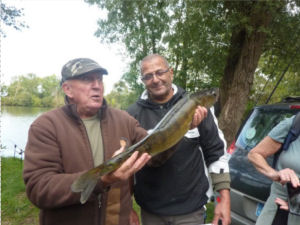 Nous poursuivons notre cheminement sur la rive opposée sur 4 km. Nous entamons la discussion avec deux pécheurs, fiers de nous montrer leur prise : un sandre de 70 cms.