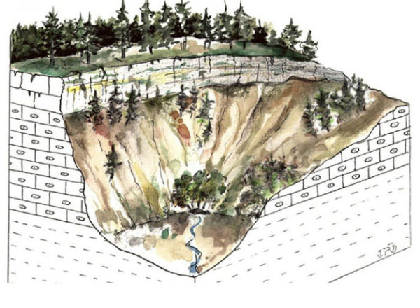 Au sommet, la corniche de calcaire dur fait office de chapeau maintenant la forte pente de lʼéboulis. À la base, la source de la Coquille sort au niveau d une couche marneuse impermeable ( marnes à huitre )